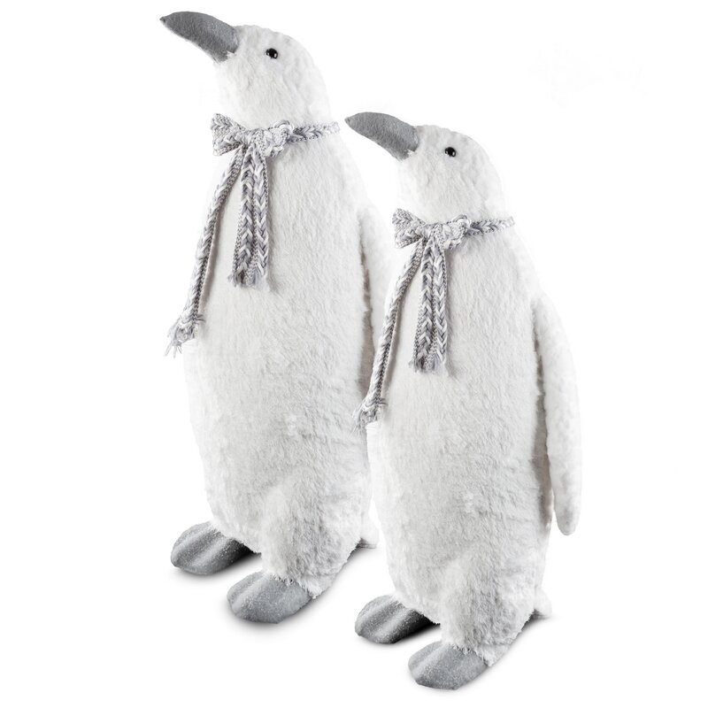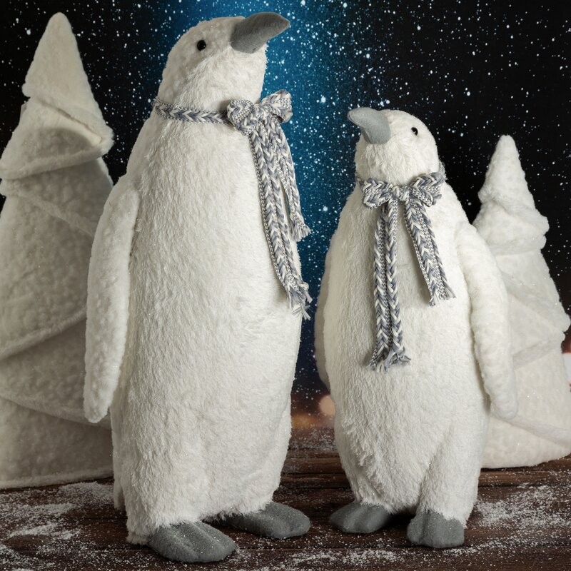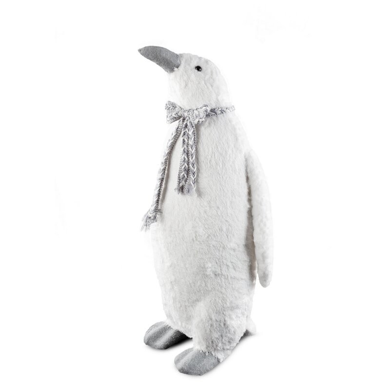 Uroczy pingwin z plecionym szalikiem to figurka, która natychmiast wprowadza świąteczny nastrój i wywołuje uśmiech! Pokryty tworzywem przypominającym futro, posypany lśniącymi drobinkami wygląda jak przytulny towarzysz zimowych dni. Jego wysokość – aż 59 cm – sprawia, że świetnie prezentuje się pod choinką, na komodzie czy w oknie. Idealny dla tych, którzy kochają przytulne, ciepłe wnętrza w zimowej odsłonie.