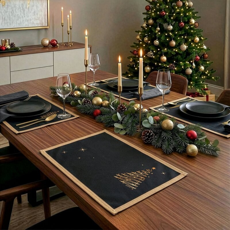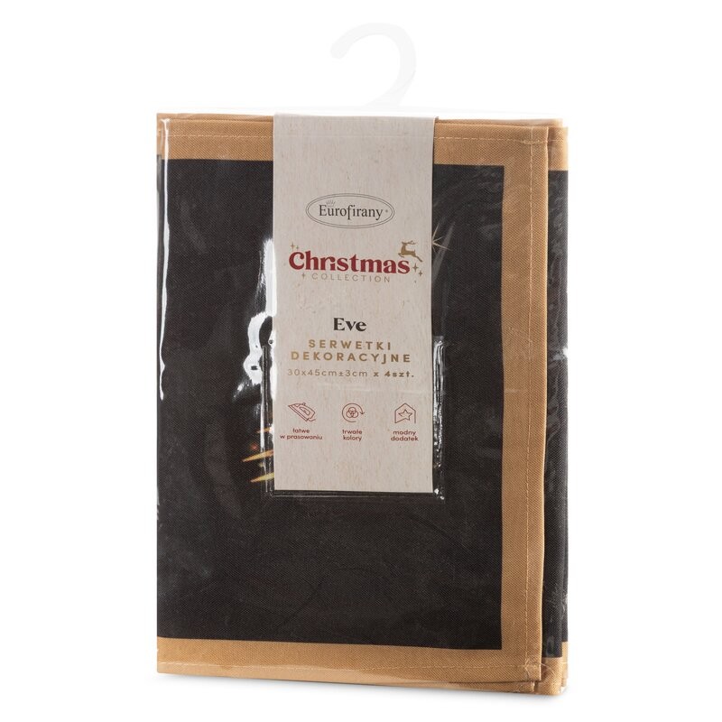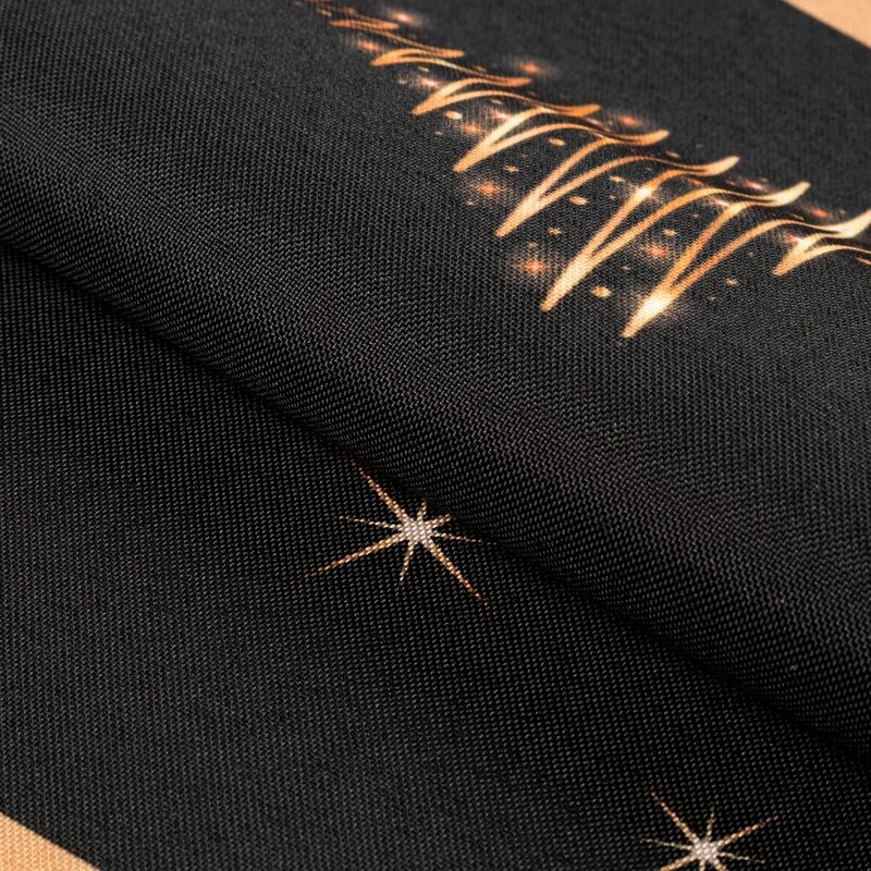 świąteczny welwetowy bieżnik dekoracyjny z nadrukiem foliowym szerokość: 40 cm, długość: 140 cm, kolor: czarny, Gramatura: 210 GSM, Skład: 100% poliester