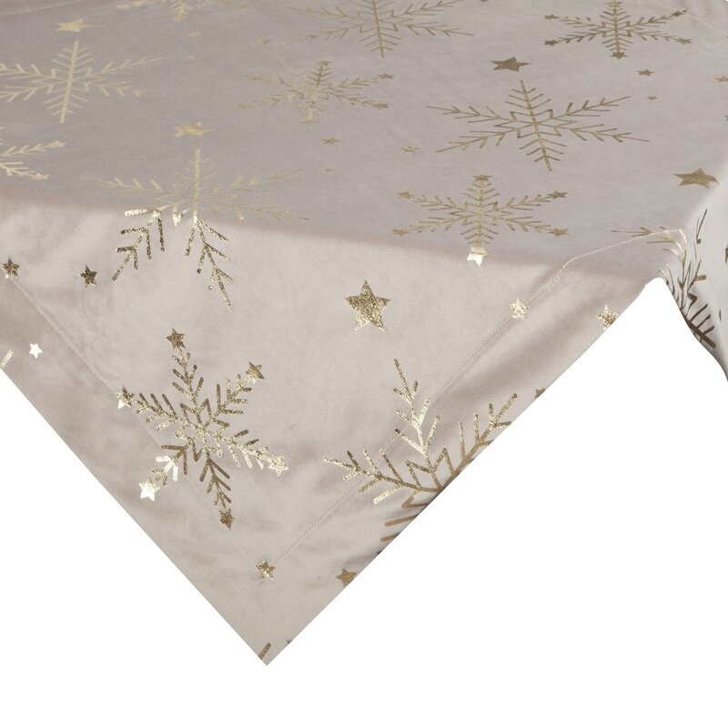 Stwórz magiczną atmosferę przy świątecznym stole! Ten wyjątkowy obrus wykonany z miękkiego, welwetowego materiału zachwyca subtelnym połyskiem oraz eleganckim wzorem błyszczących, szampańskich śnieżynek. Każdy detal został zaprojektowany tak, by dodać aranżacji luksusu i świątecznego uroku.
