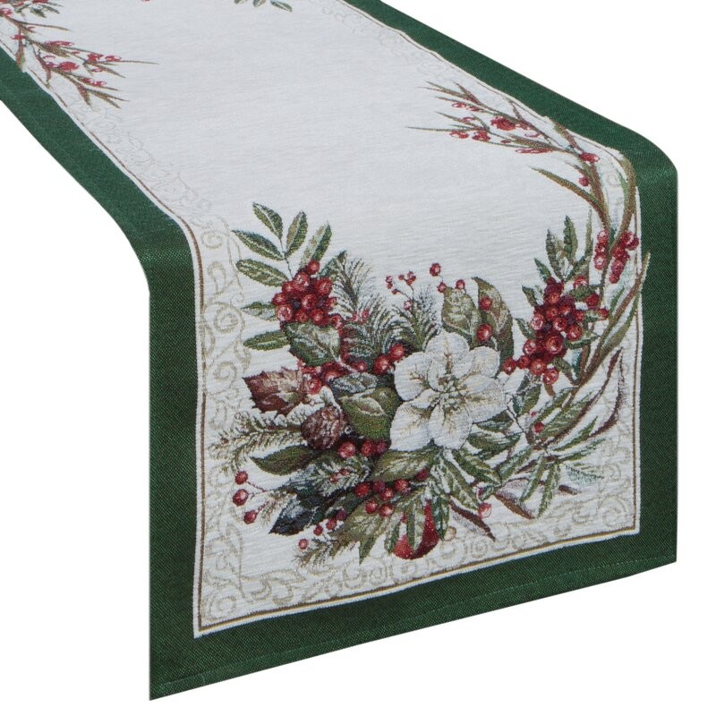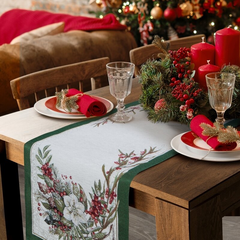 Bieżnik świąteczny na stół 33x183 cm kremowo, zielony zdobiony uroczym nadrukiem