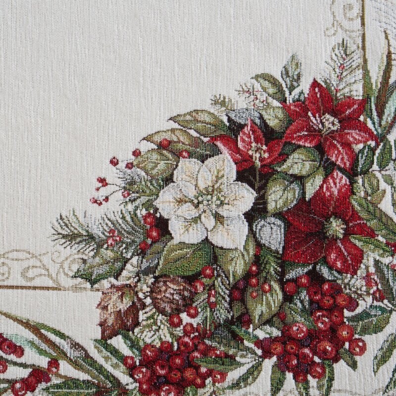 Obrus gobelinowy z motywem świątecznym, przetykany srebrną nicią