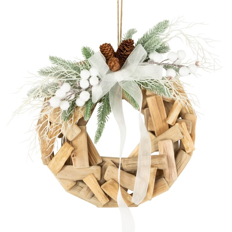 Świąteczny wianek dekoracyjny to naturalna i urokliwa ozdoba, która wprowadza do wnętrza rustykalny, przytulny klimat Bożego Narodzenia. Drewniane elementy, starannie ułożone w formę wianka, tworzą solidną bazę, która zachwyca swoją prostotą i naturalnym pięknem. Wianek zdobią zielone gałązki, które dodają mu świeżości i podkreślają świąteczny charakter, a szyszki, będące symbolem zimy i natury, dopełniają całości dekoracji.