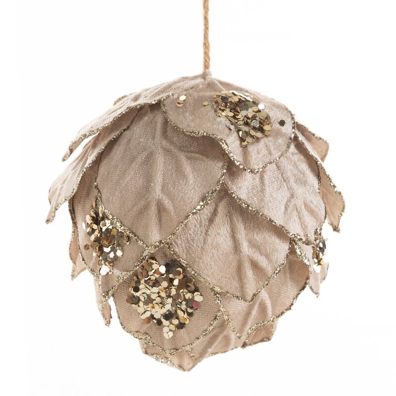 Wprowadź do swojego domu magię świąt z wyjątkową ozdobą choinkową w kształcie szyszki, wykonaną z miękkiej, lśniącej tkaniny welwetowej. Jej subtelny połysk i delikatne drobinki tworzą efekt luksusowej elegancji, który pięknie komponuje się ze światłem choinkowych lampek. Ta bombka to połączenie klasy i świątecznego blasku — doskonała do dekoracji choinki, stroików czy świątecznych kompozycji na stole lub w oknie.