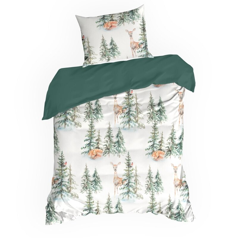 Wprowadź do swojej sypialni przytulny, świąteczny nastrój dzięki kompletowi pościeli wykonanej z wysokiej jakości bawełny ranforce. Po jednej stronie pościel zdobiona jest klasycznym nadrukiem zimowego lasu, natomiast druga strona pozostaje gładka w eleganckim, zielonym odcieniu, co pozwala na łatwe dopasowanie wyglądu sypialni do nastroju i dekoracji wnętrza.