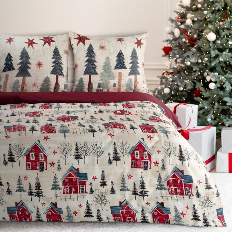 Komplet pościeli bawełnianej z nadrukiem świątecznym szerokość: 140 cm, długość: 200 cm, kolor: czerwony, Gramatura: 105 GSM, Skład: 100% bawełna