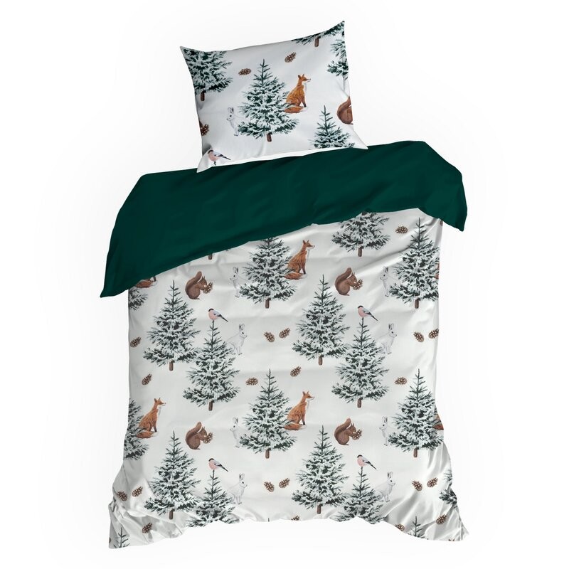 Pościel świąteczna 160x200 cm bawełna ranforce kolor biały, zielony z nadrukiem zimowego lasu DEER
