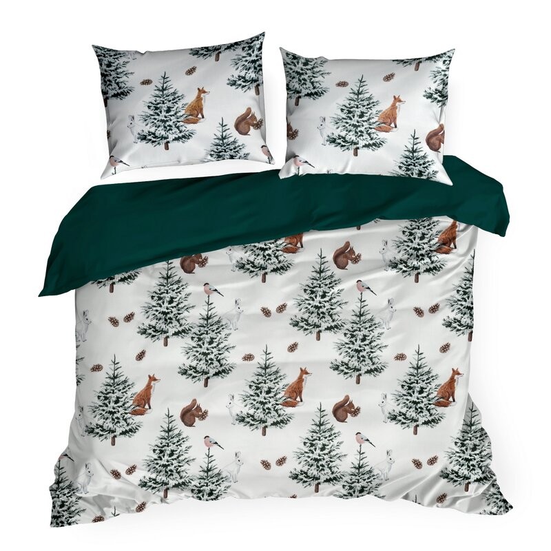 Pościel świąteczna 140x200 cm bawełna ranforce kolor biały, zielony z nadrukiem zimowego lasu DEER