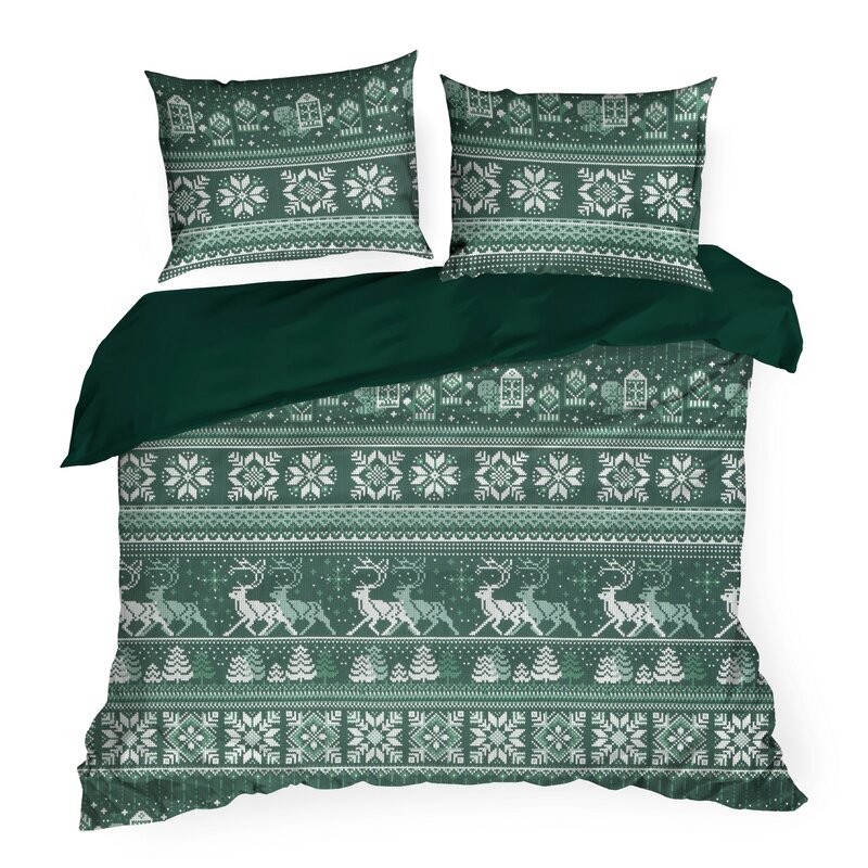 Komplet pościeli bawełnianej z nadrukiem świątecznym szerokość: 140 cm, długość: 200 cm, kolor: ciemnozielony, Gramatura: 105 GSM, Skład: 100% bawełna