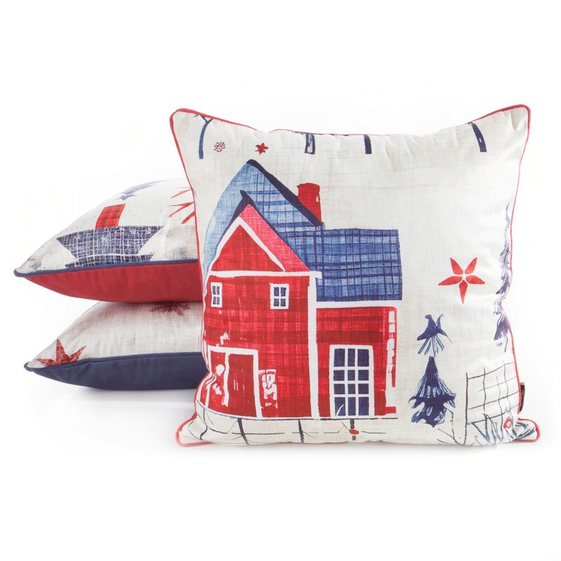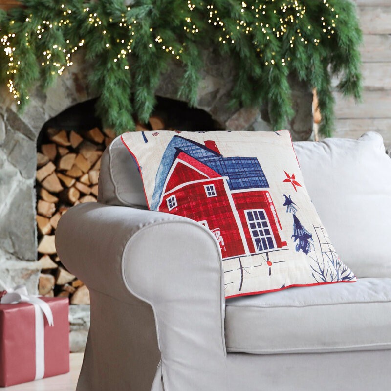 Poszewka na poduszkę welwetowa 45x45 cm zdobiona uroczym nadrukiem domków świątecznych