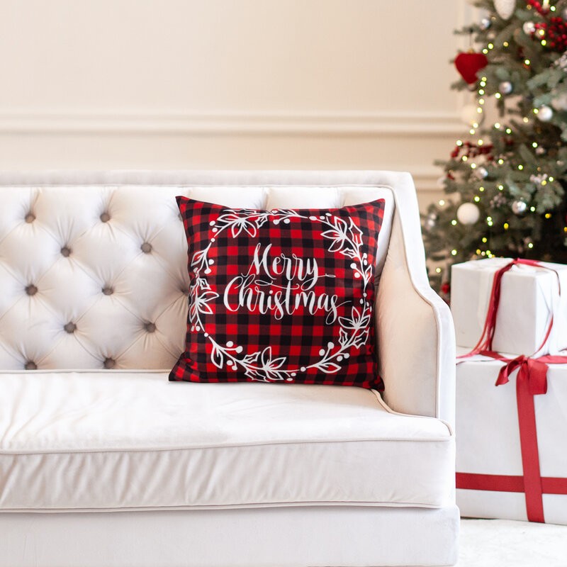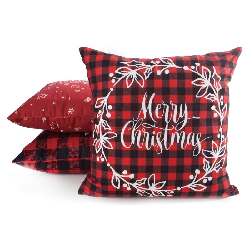 Poszewka świąteczna SANTA z miękkiego welwetu z motywem kratki i wypustką na brzegach