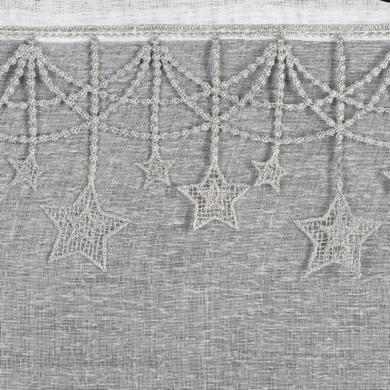 Ta elegancka firana z etaminy to idealna dekoracja na świąteczny czas. Lekka i półtransparentna tkanina subtelnie przepuszcza światło, tworząc przytulny nastrój, a w górnej części zdobi ją haftowana aplikacja z motywem gwiazdek, która nadaje całości wyjątkowego uroku i podkreśla bożonarodzeniowy klimat wnętrza.