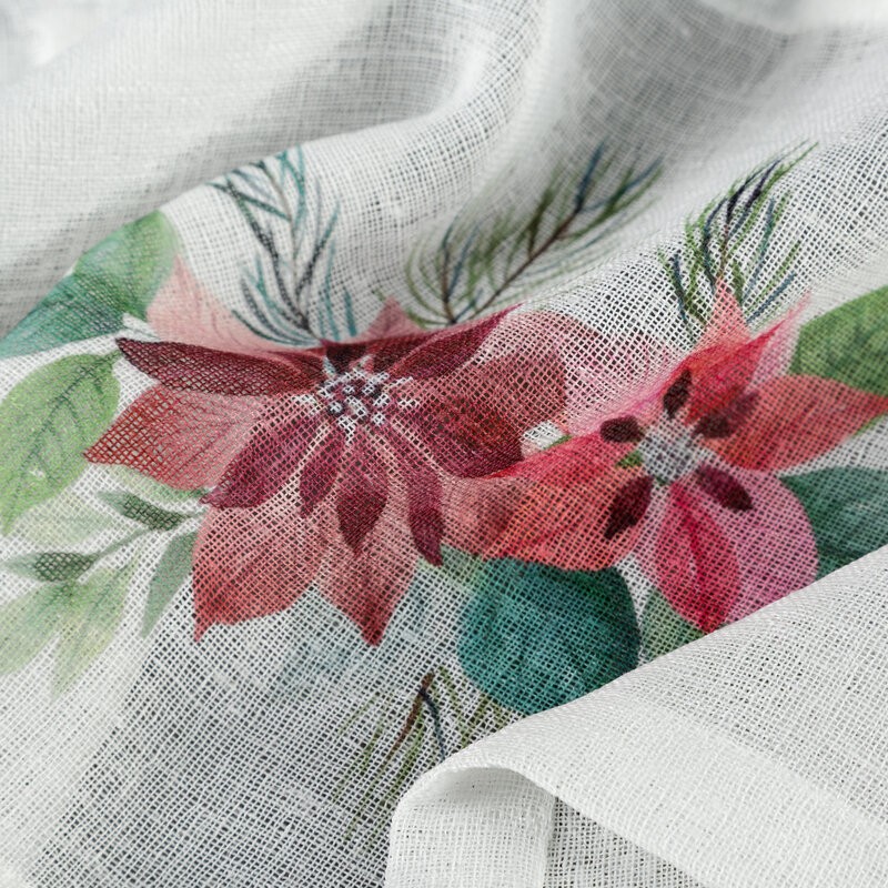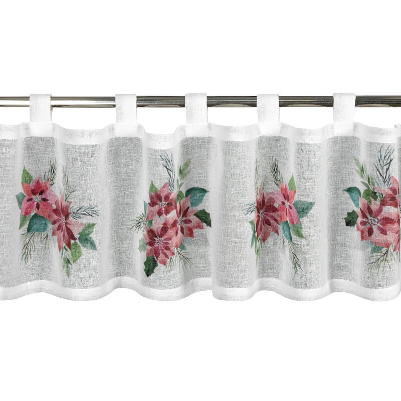 Świąteczna zazdrostka uszyta z lekkiej i półtransparentnej etaminy to idealna dekoracja kuchennego lub jadalnianego okna. Jej powierzchnię zdobi nadruk gwiazd betlejemskich, które nadają wnętrzu eleganckiego, świątecznego charakteru i wprowadzają przytulny, bożonarodzeniowy klimat.