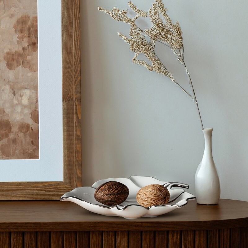 Piękna patera dekoracyjna w białym, połyskującym kolorze to doskonały element, który podkreśli charakter każdego wnętrza. Jej srebrne akcenty na brzegach dodają elegancji i lekkości, tworząc spójną całość z nowoczesnym designem.
