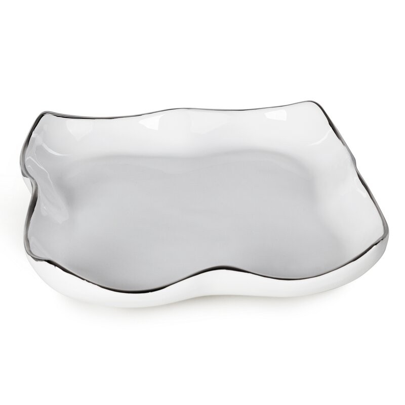 Piękna patera dekoracyjna w białym, połyskującym kolorze to doskonały element, który podkreśli charakter każdego wnętrza. Jej srebrne akcenty na brzegach dodają elegancji i lekkości, tworząc spójną całość z nowoczesnym designem.