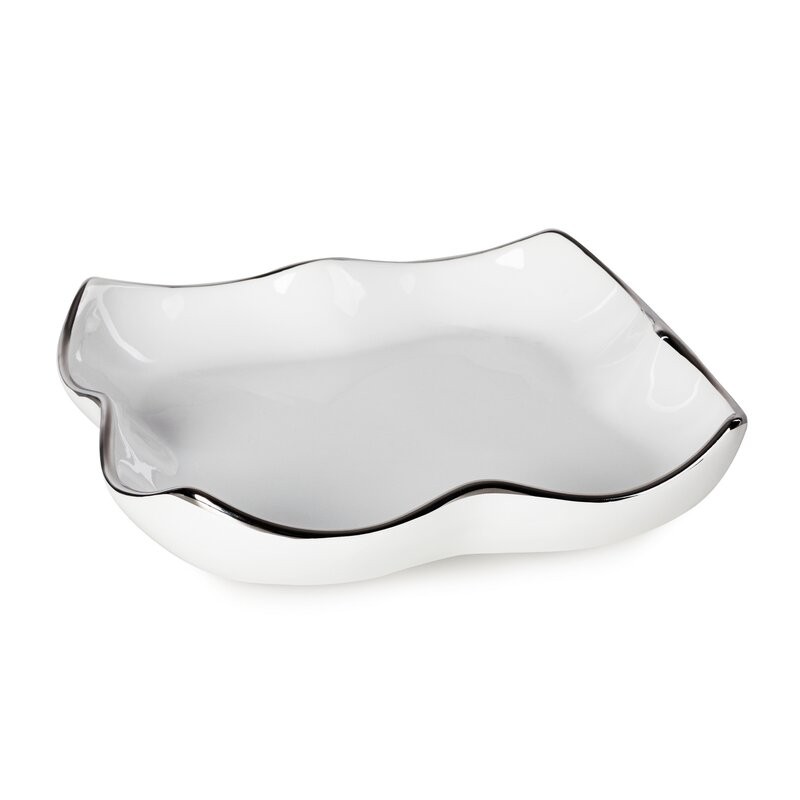 Piękna patera dekoracyjna w białym, połyskującym kolorze to doskonały element, który podkreśli charakter każdego wnętrza. Jej srebrne akcenty na brzegach dodają elegancji i lekkości, tworząc spójną całość z nowoczesnym designem.