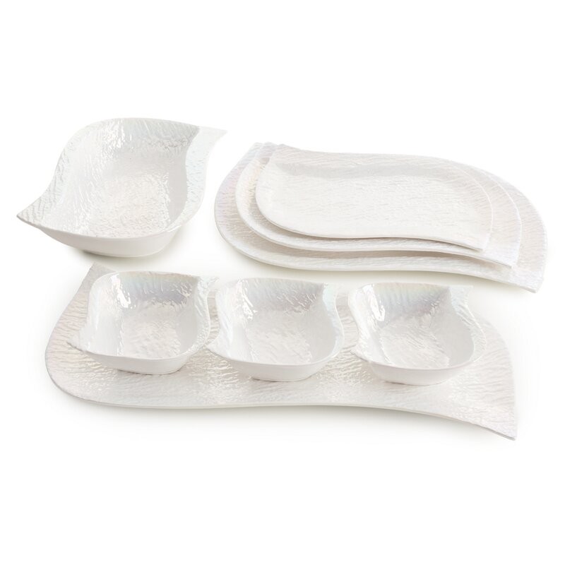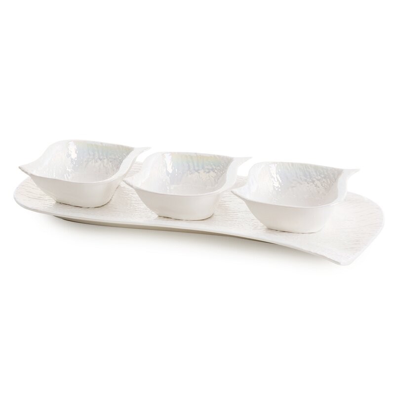 Zestaw ceramiczny składający się z paterki i trzech miseczek wykonany jest z wysokiej jakości glinki ceramicznej. Całą powierzchnię zdobi wypukły, subtelny wzór, który nadaje naczyniom wyjątkowego charakteru i elegancji. Perłowy kolor, mieniący się w tęczowe refleksy w zależności od światła, tworzy luksusowy efekt wizualny, dzięki czemu zestaw stanie się zarówno praktycznym elementem do serwowania słodkości czy owoców, jak i efektowną dekoracją stołu.