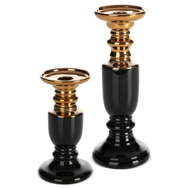 Świecznik z glinki ceramicznej o klasycznym kształcie, to wyrafinowany element dekoracyjny, który wnosi do wnętrza luksusowy akcent. Górna część świecznika, w kolorze złota, przyciąga wzrok swoim subtelnym blaskiem, nadając całości elegancji i wytworności. Kontrastuje ona z błyszczącą, czarną podstawą, która dodaje świecznikowi nowoczesnego, stonowanego charakteru.