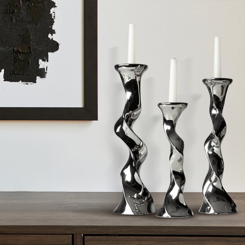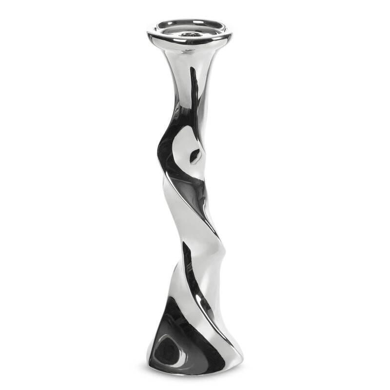 Ten nowoczesny świecznik o skręconej formie to prawdziwa ozdoba każdego wnętrza. Jego błyszcząca, srebrna powierzchnia subtelnie odbija światło, tworząc wyjątkową atmosferę elegancji i stylu. Wykonany z wysokiej jakości materiału, zachwyca rzeźbiarską formą, która łączy nowoczesny design z nutą artystycznej ekstrawagancji.