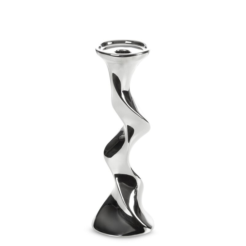 Ten nowoczesny świecznik o skręconej formie to prawdziwa ozdoba każdego wnętrza. Jego błyszcząca, srebrna powierzchnia subtelnie odbija światło, tworząc wyjątkową atmosferę elegancji i stylu. Wykonany z wysokiej jakości materiału, zachwyca rzeźbiarską formą, która łączy nowoczesny design z nutą artystycznej ekstrawagancji.