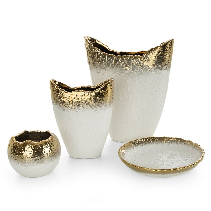 Ceramiczny wazon z kolekcji SERIN łączy elegancję z nowoczesnym designem. Wypukła struktura oraz cieniowany, biało-złoty kolor nadają mu wyjątkowej głębi i subtelnego luksusu. Doskonały jako samodzielna dekoracja lub w zestawie z innymi elementami kolekcji, tworząc harmonijną aranżację wnętrza.