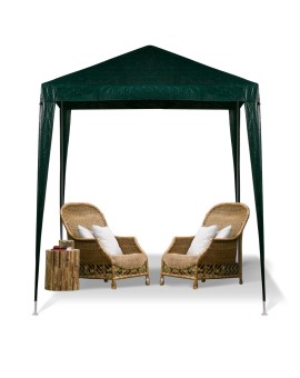 Duży, zielony pawilon imprezowy. Idealny na imprezy w ogrodzie. Nie posiada ścian, jest sam dach. Chroni przed słońcem i deszczem. Tworzywo: metal, PE, plastik. Wymiary: 2 m x 2 m. Wysokość: 2,4 m.