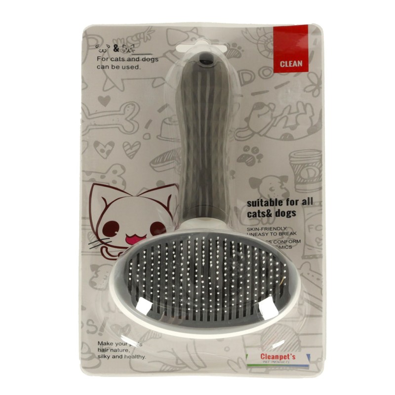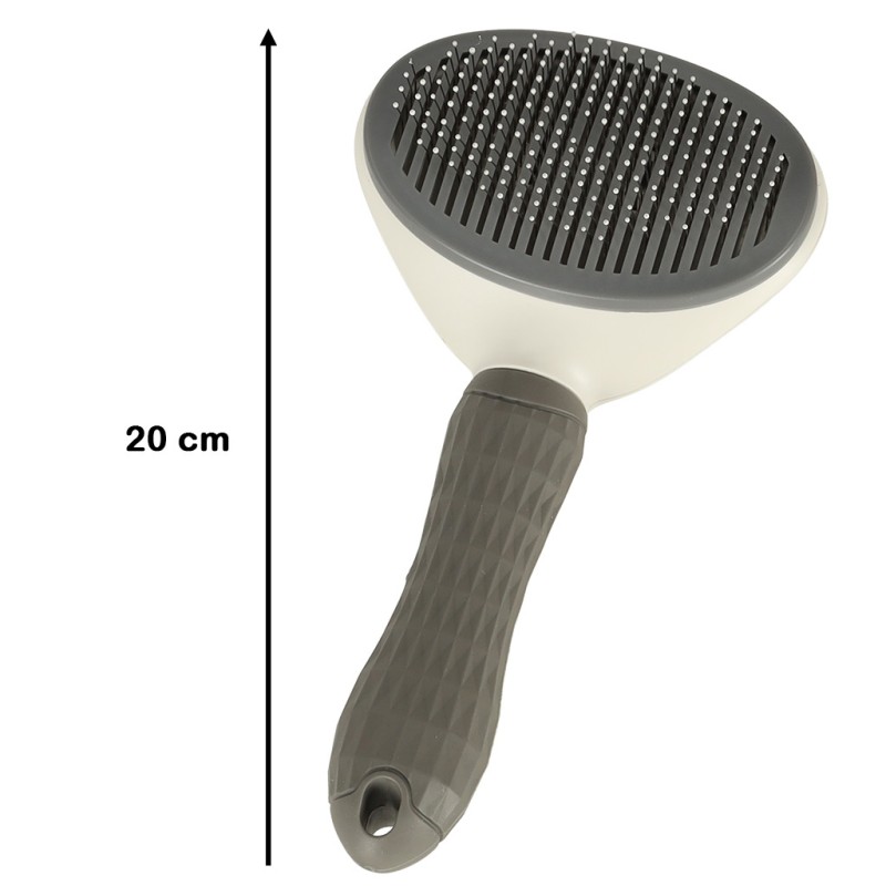 Szczotka, dodatkowo, posiada mechanizm samooczyszczenia. Oznacza to, że podczas czesania czworonoga nie musisz wygrzebywać sierści spomiędzy ząbków szczotki. Wystarczy wcisnąć przycisk, a cała wyczesana sierść z łatwością odejdzie od szczotki.