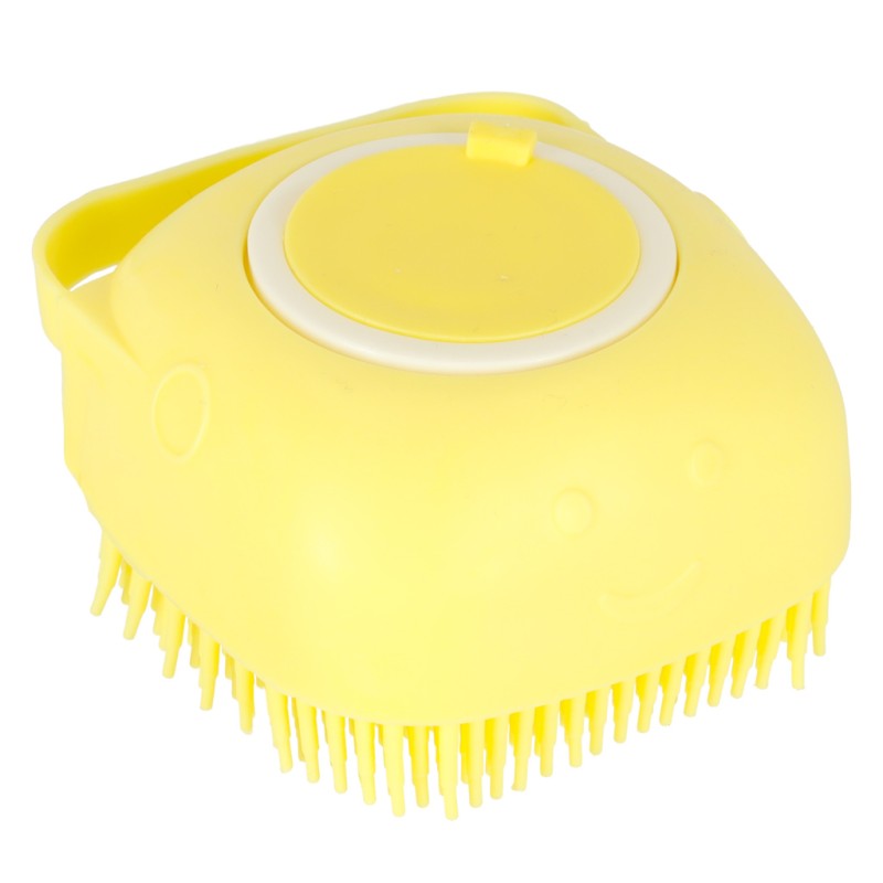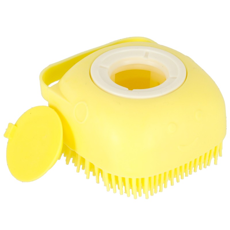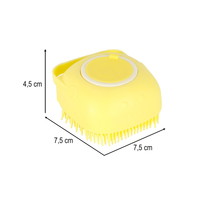 Silikonowa szczotka do mycia zwierząt. Posiada praktyczny dozownik na szampon lub płyn do mycia oraz wygodny uchwyt. Silikonowe wypustki wymasują czworonoga. Można używać na sucho lub na mokro. Prosta w użytkowaniu i czyszczeniu. Wym.: 7,5x7,5x4,5cm.