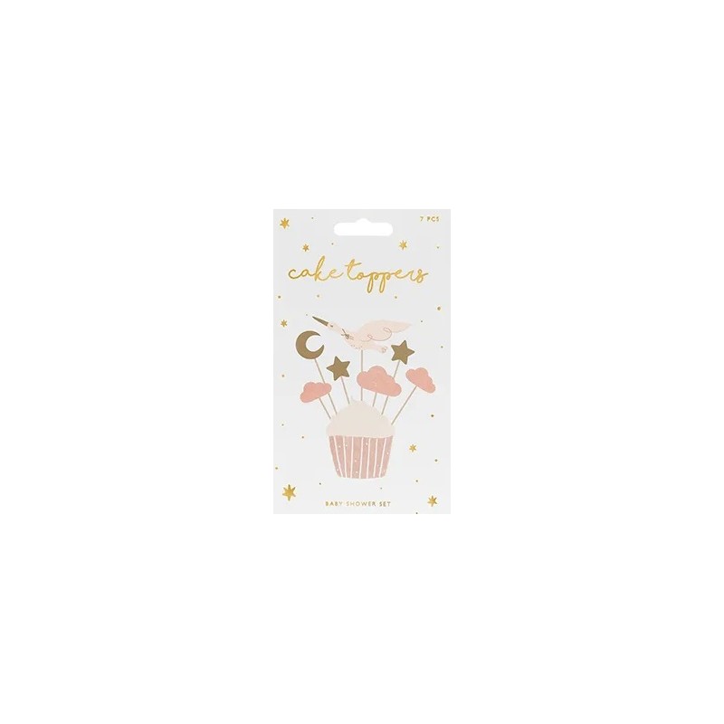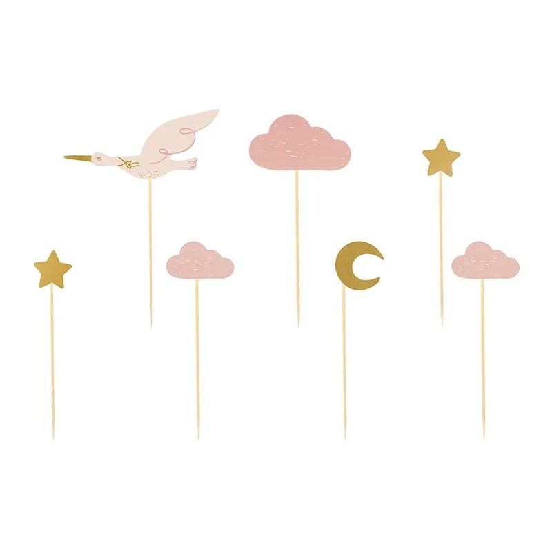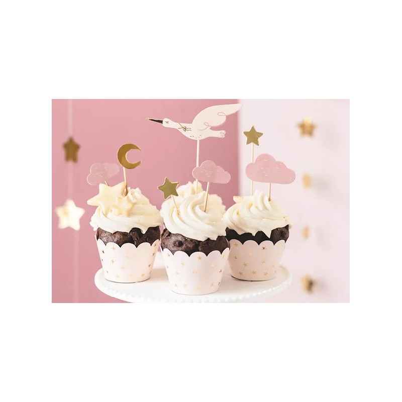 Śliczne dekoracje do babeczek i muffinek, które sprawią, że wypieki wręcz zamienią się w piękne dzieła sztuki - aż szkoda będzie jeść! Bocian, chmurki, księżyc i gwiazdki. Kolor: różowy + złoty. Ilość: 7. Wysokość: 11-12 cm.
