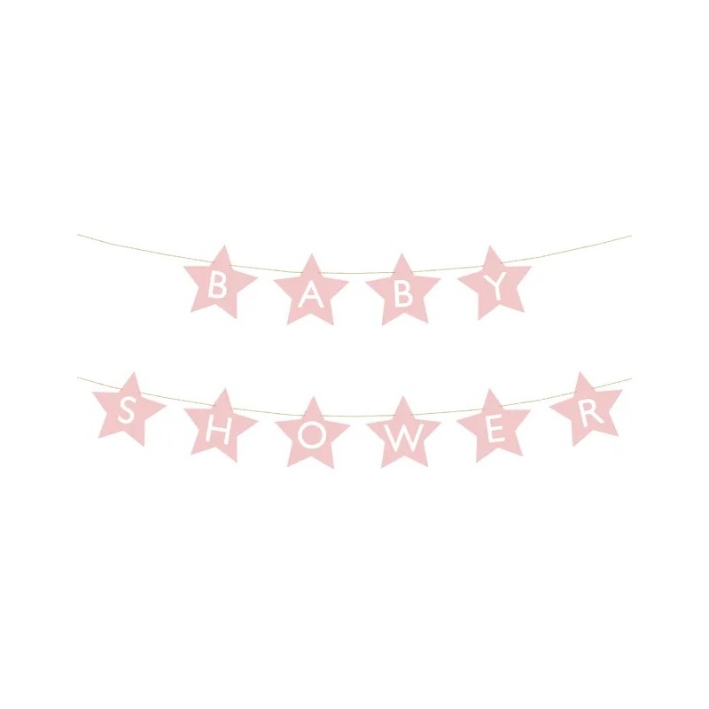 Baner w kształcie gwiazdek z napisem Baby Shower wykonany z papieru w kolorze jasnoróżowym, wymiary sznurka ok. 3m.