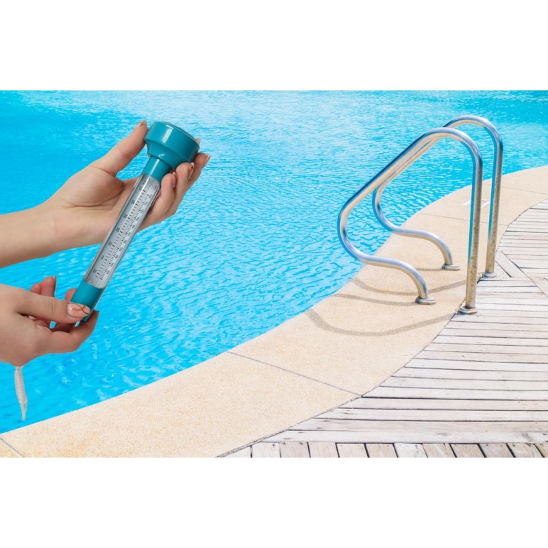Termometr do basenu to jeden z tych akcesoriów, który z pewnością przyda Ci się podczas letni miesięcy. Z jego pomocą w łatwy sposób sprawdzisz, czy woda w basenie jest odpowiednio ciepła. Dzięki specjalnej konstrukcji termometr będzie stale unosił się na powierzchni wody. Dodatkowo wyposażony jest w sznurek umożliwiający przywiązanie go do stelażu basenu.