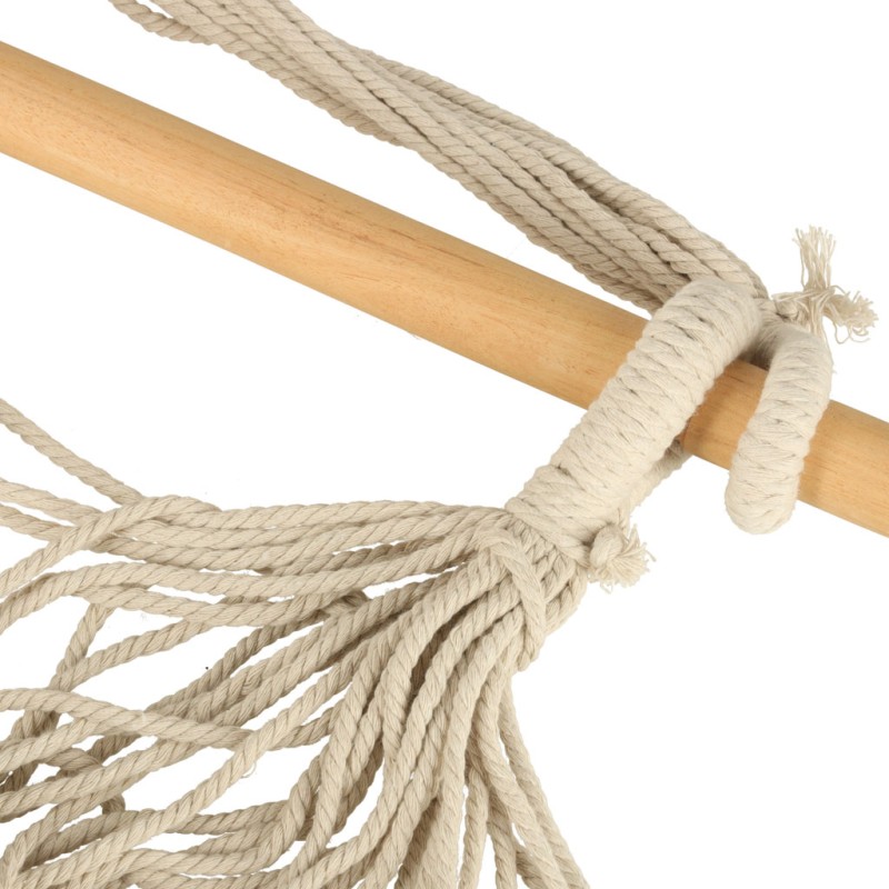 Hamak boho z frędzlami w kolorze ecru, z drewnianymi drążkami (100 cm) i powierzchnią leżenia 200×100 cm. Całkowita długość 280 cm. Udźwig 150 kg. Materiał: 65% bawełna, 35% poliester. Frędzle 27 cm