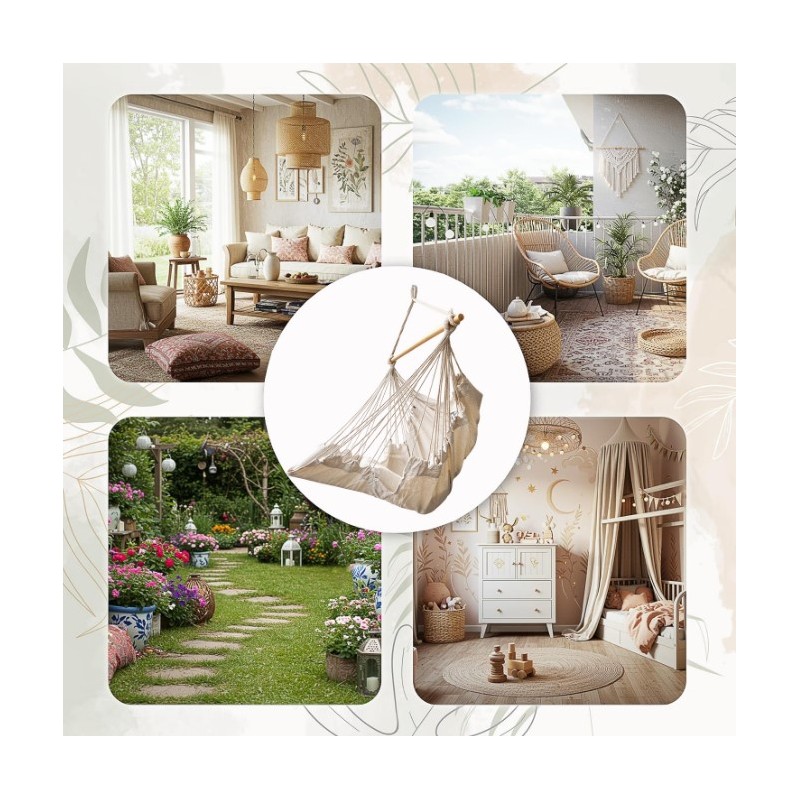 Leżak brazylijski w stylu boho z podnóżkiem do bujania się w pozycji leżącej lub siedzącej. Idealne miejsce do czytania, spania, odpoczynku i relaksu. Wymiary: 160 cm x 100 cm x 130 cm, kolor: beżowy