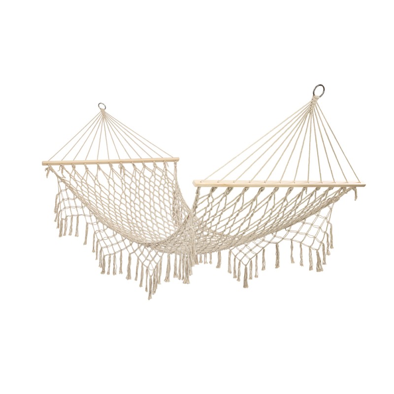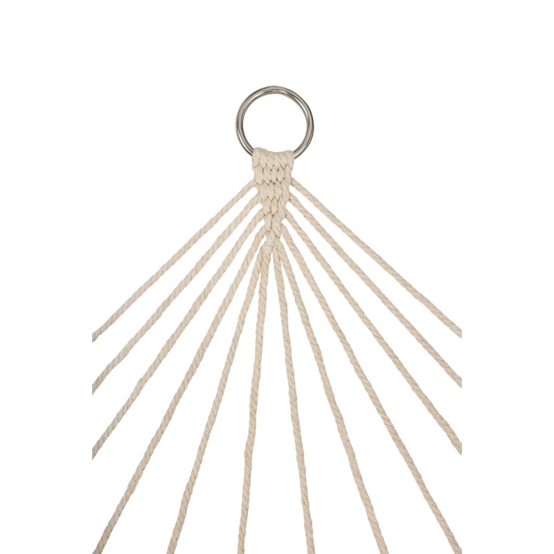 Zainspirowany brazylijskim klimatem hamak boho przyciąga wzrok zwisającymi frędzlami i subtelną siatką, która nie tylko zdobi, ale i zapewnia przyjemne uczucie przewiewności w ciepłe dni. Delikatna struktura materiału nadaje całości elegancki wygląd i sprawia, że hamak staje się dekoracyjnym elementem każdej ogrodowej aranżacji.