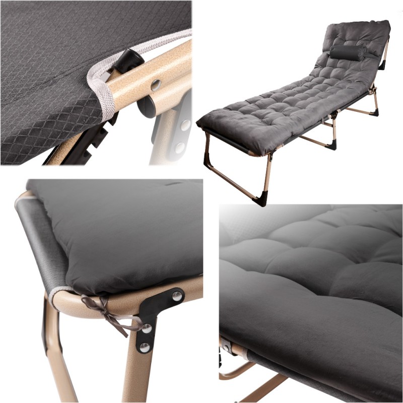 Turystyczne składane łóżko z 4-poziomową regulacją oparcia. Miękki materac i poduszka w zestawie zapewniają komfortowy sen i wypoczynek w pomieszczeniu oraz na zewnątrz. Wymiary łóżka: 193 cm x 66, kolor: czarny