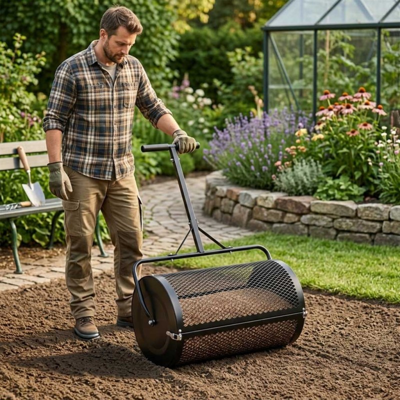Informacje bezpieczeństwa: Przed użyciem zapoznaj się z instrukcją obsługi. Produkt nie jest zabawką - przechowuj poza zasięgiem dzieci. Używaj tylko na płaskim, równym terenie. Nie przeciążaj rozsiewacza nadmierną ilością materiału. Nie modyfikuj produktu. Podczas pracy używaj rękawic ochronnych. Regularnie sprawdzaj stan siatki, walca i uchwytu.