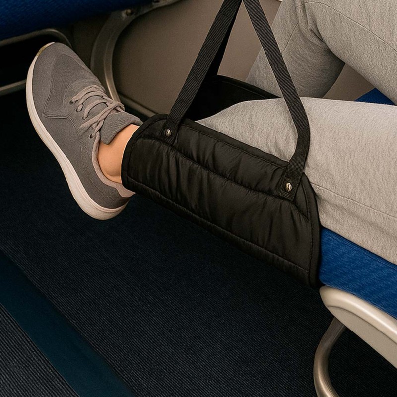 Podnóżek można zawiesić na przednim siedzeniu w pociągu lub w samolocie, dostosowując długość paska do preferowanej wysokości. Ma on wypełnienie z miękkiej pianki, która dobrze utrzymuje ciężar stóp, zapewniając stabilne podparcie. Podnóżek zapobiega drętwieniu i obrzękom nóg, zapewniając swobodne krążenie krwi.