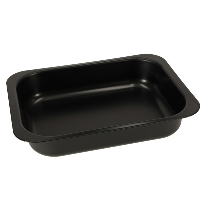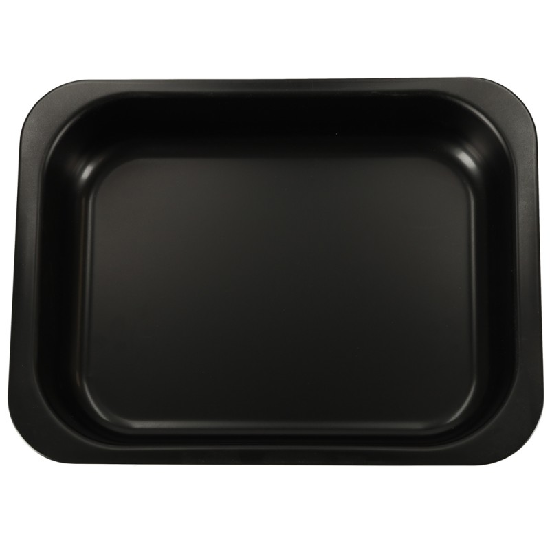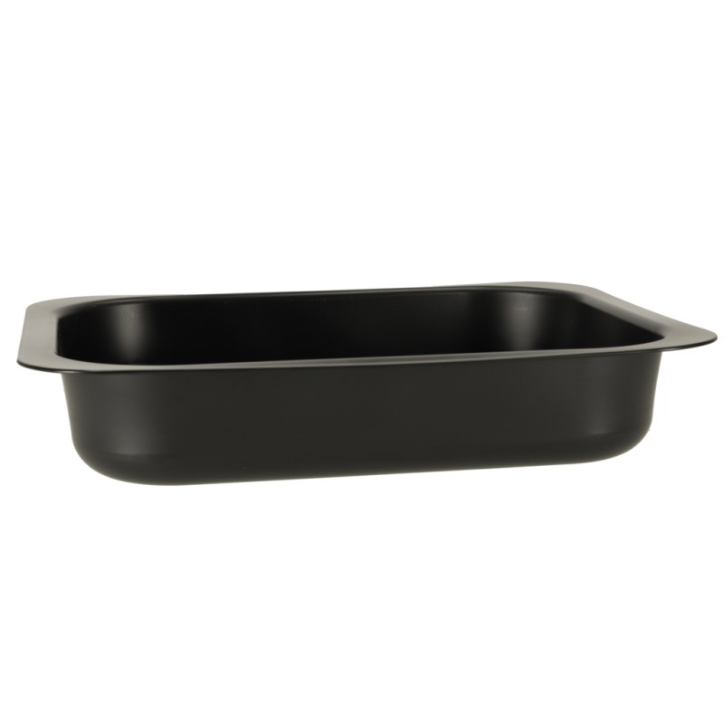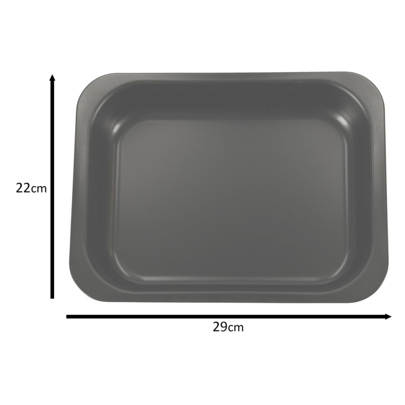 Prostokątna blacha do pieczenia zarówno wyrobów słodkich, jak i wytrawnych. Posiada gładkie dno i zaokrąglone brzegi. Do piekarników elektrycznych i gazowych. Kolor: czarny. Tworzywo: stal z powłoką antyadhezyjną. Wymiary: 29 x 22 x 6 cm.