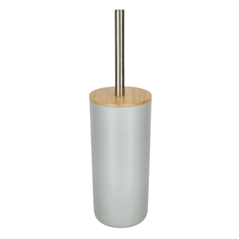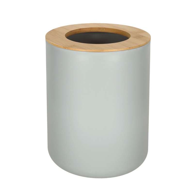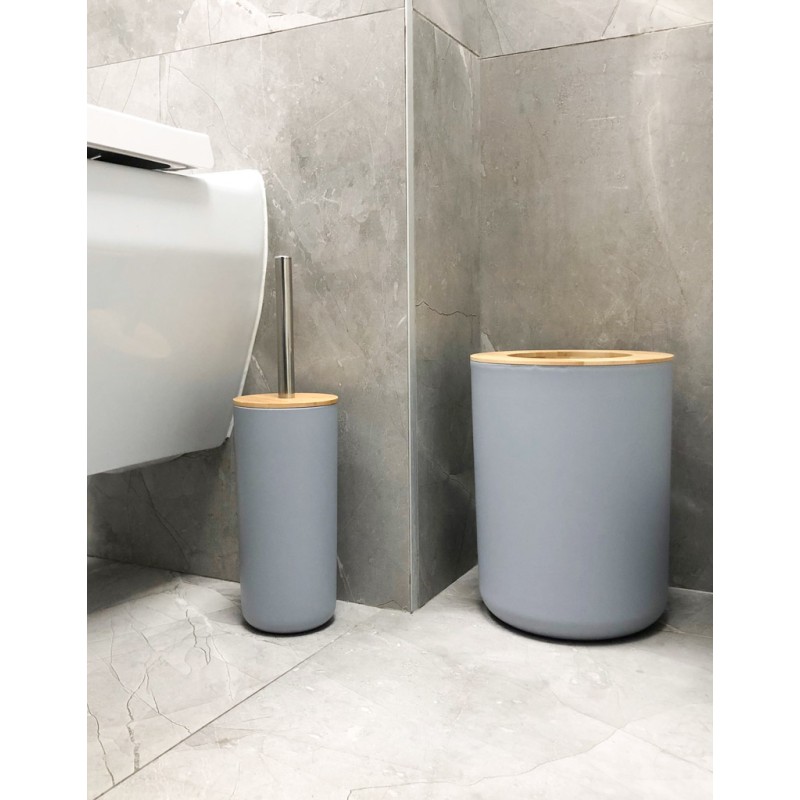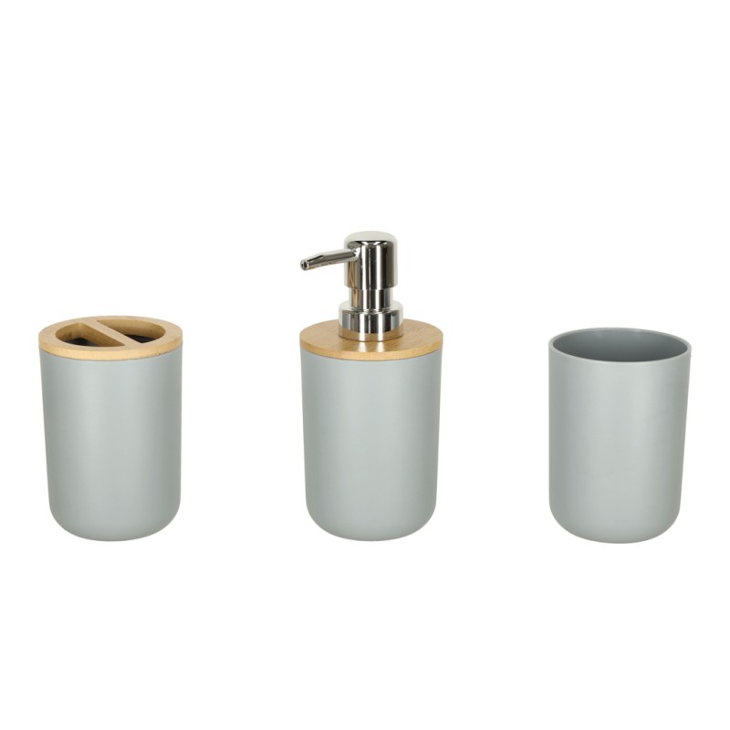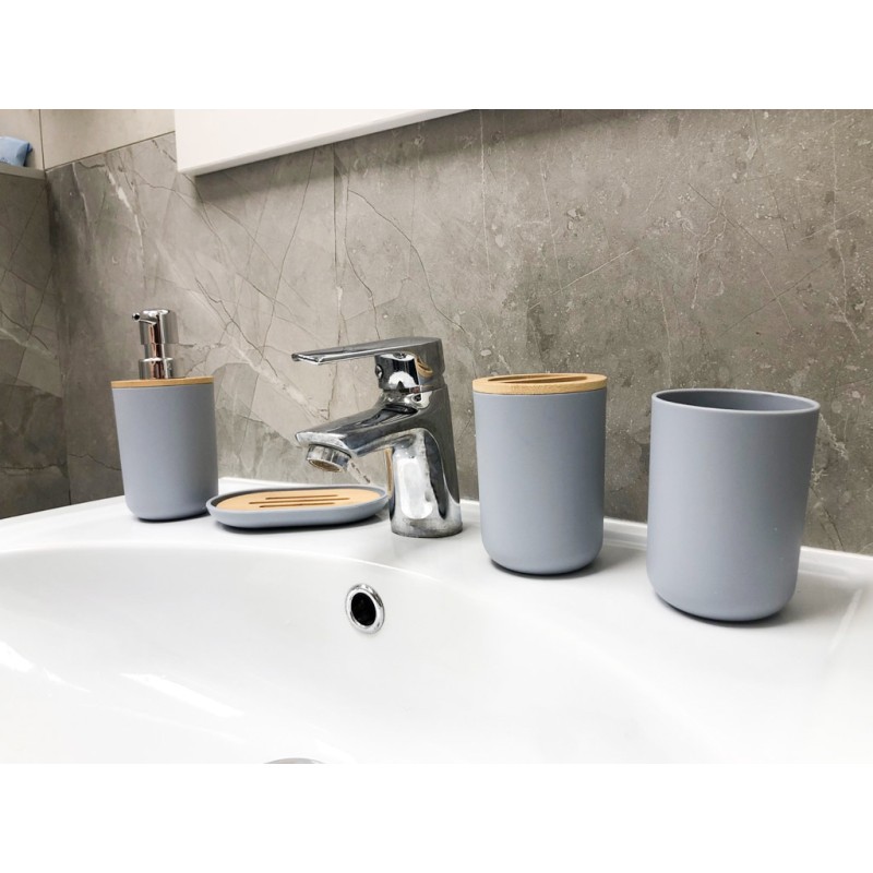 Zestaw lazienkowy w szarym kolorze i z drewnianymi elementami. Składa się z sześciu elementów: mydelniczki, dozownik mydła, szczotka wc, kubek, pojemnik na szczoteczki oraz kosz na śmieci. Tworzywo: plastik, drewno. Wymiary dozownika: 15,5 cm x 7,5 cm.