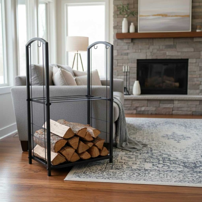W tym stojaku na drewno kominkowe z akcesoriami każdy detal jest przemyślany i funkcjonalny. Narzędzia kominkowe masz zawsze w zasięgu ręki, a specjalna strefa na przechowywanie akcesoriów kominkowych utrzymuje idealny porządek wokół ognia. Dodatkowo konstrukcja zapewnia stabilność nawet wtedy, gdy przechowujesz w nim kominkowe drewno, dzięki czemu cały zestaw pozostaje praktyczny, harmonijny i zaskakująco lekki wizualnie.