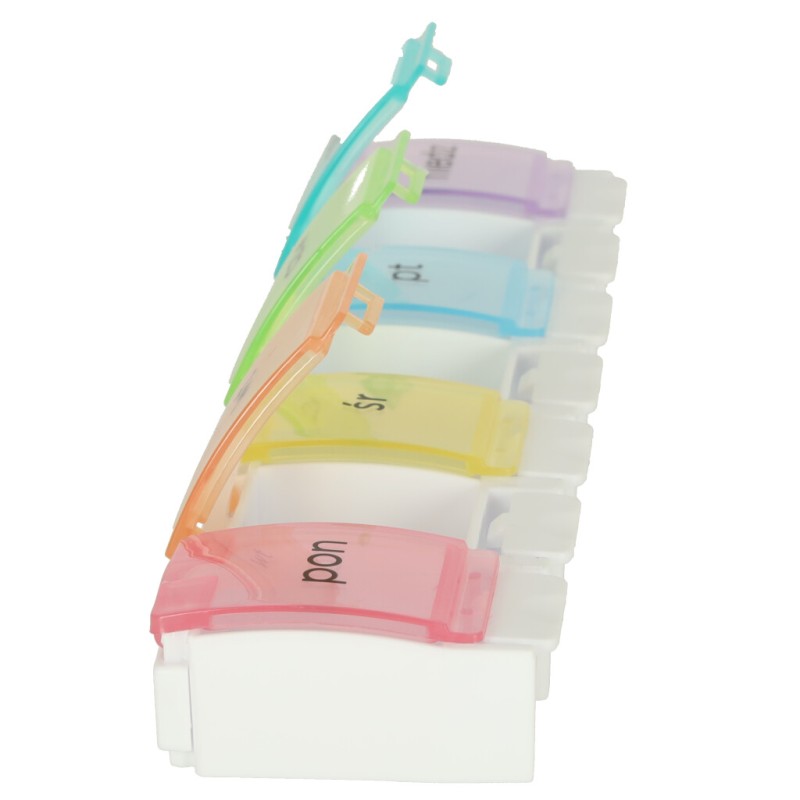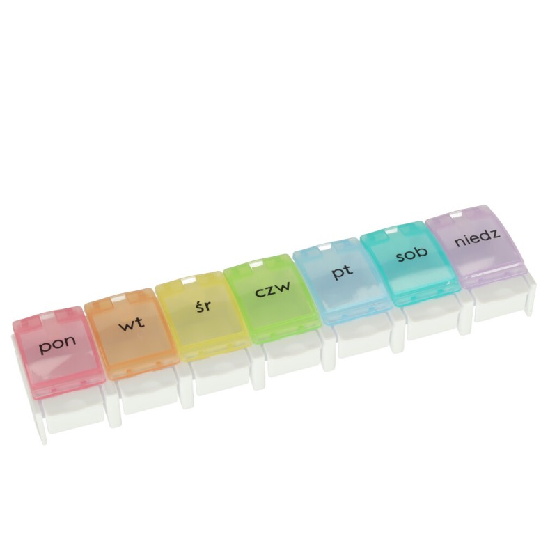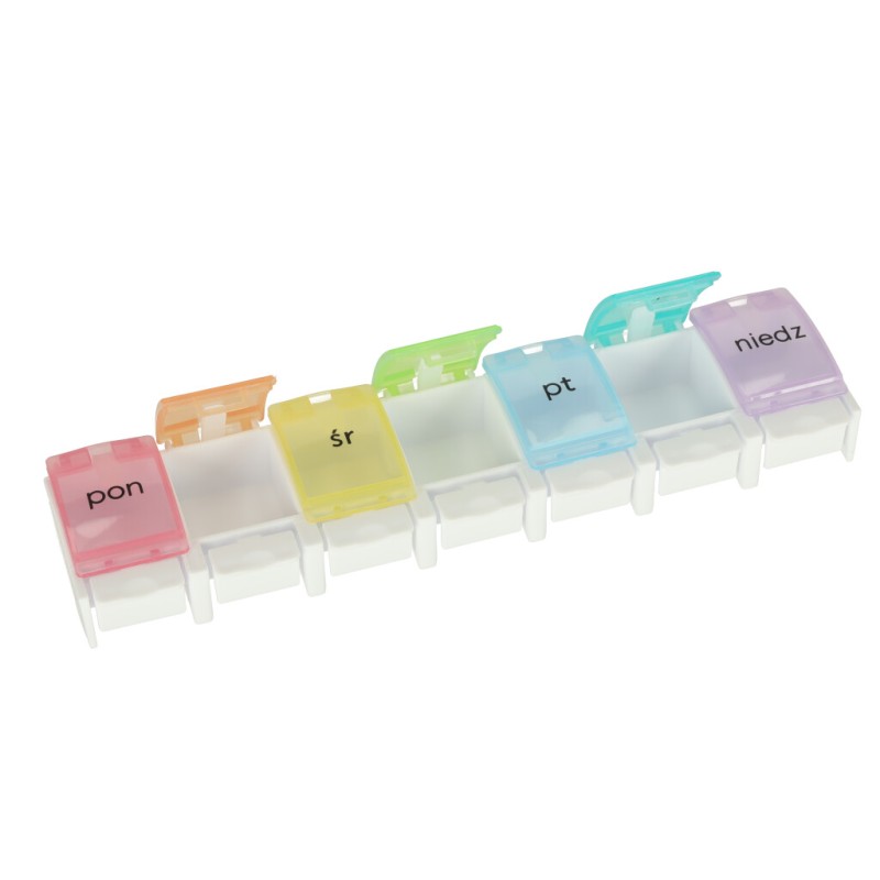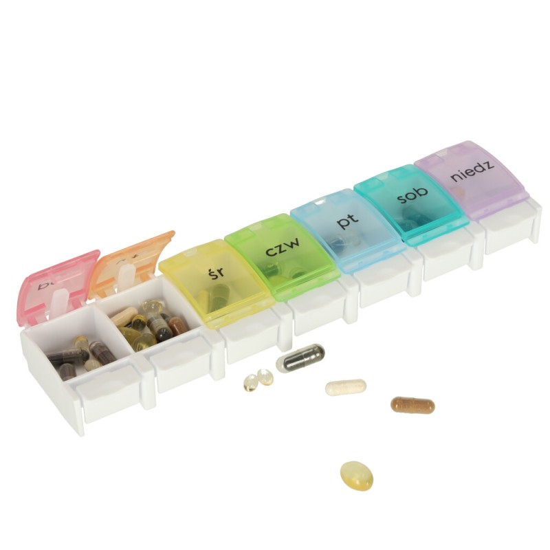 Każda z przegródek jest podpisana po polsku, a poszczególnym dniom tygodnia został przypisany inny kolor. Włożenie tabletek do tygodniowych kasetek ułatwi ich regularne przyjmowanie!