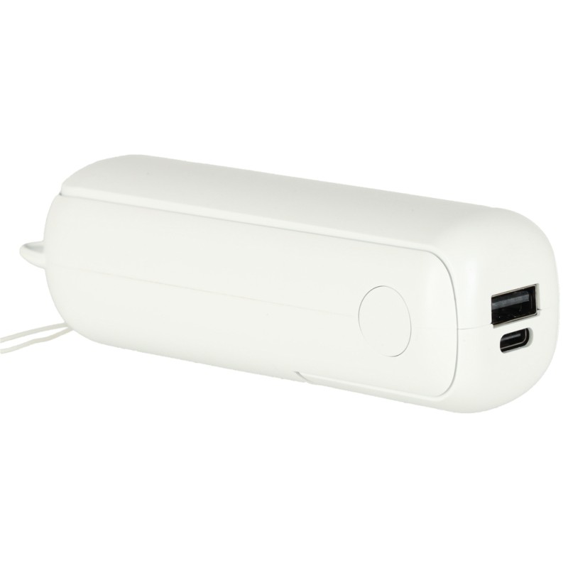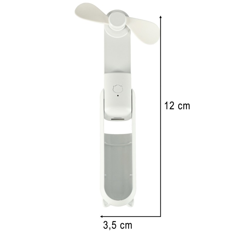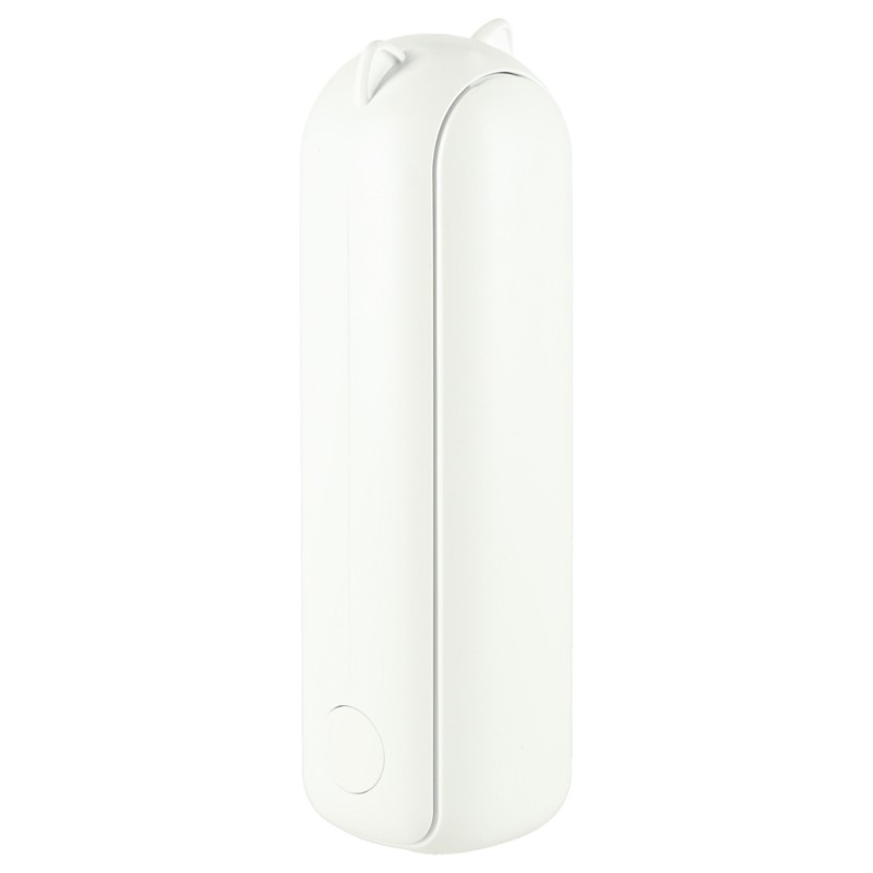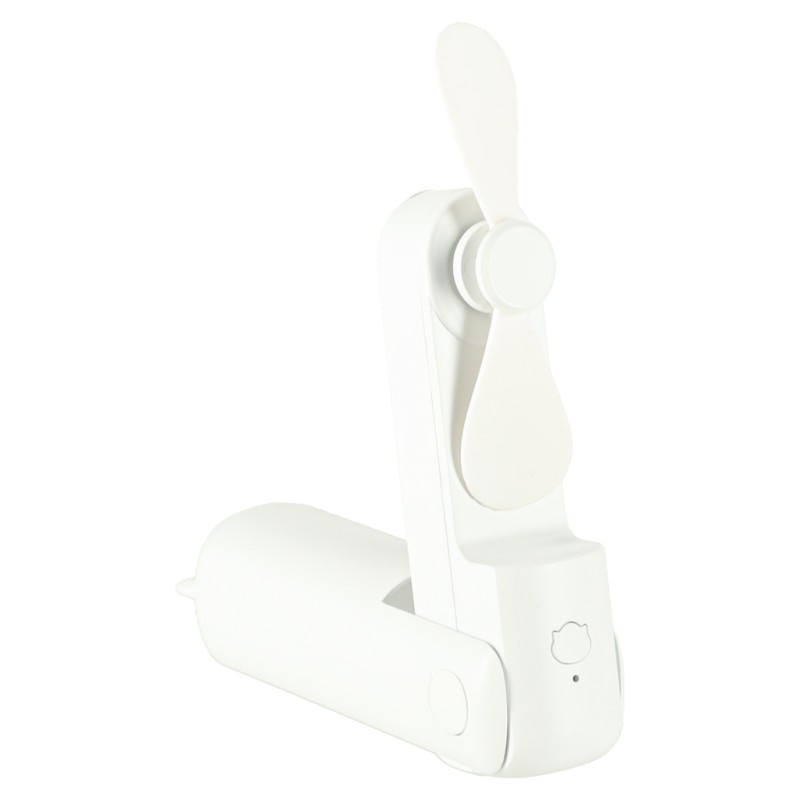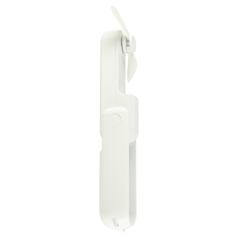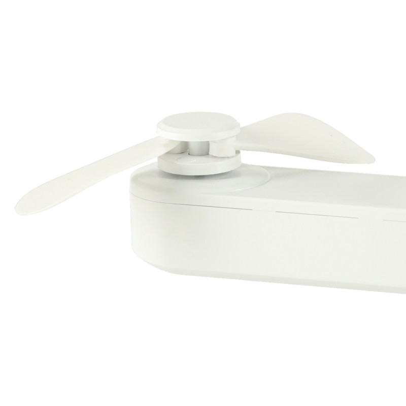 Przenośny wiatrak z podstawką i smyczą - do noszenia przy sobie lub postawienia na biurku. Włącznik z tyłu uruchamia 3 tryby nawiewu, a za pomocą portu USB można naładować go w domu i w aucie. Wymiary: 13,8 cm x 6,2 cm x 4,3 cm, kolor: biały