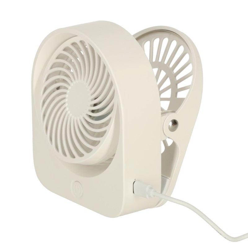 Przenośny wiatrak z podstawką i smyczą - do noszenia przy sobie lub postawienia na biurku. Włącznik z tyłu uruchamia 3 tryby nawiewu, a za pomocą portu USB można naładować go w domu i w aucie. Wymiary: 13,8 cm x 6,2 cm x 4,3 cm, kolor: biały