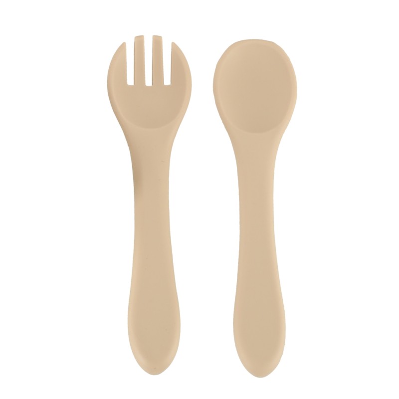 dwa zestawy sztućców zostały zaprojektowane z myślą o małych rączkach, aby dziecko mogło łatwo je chwycić i z łatwością z nich korzystać
