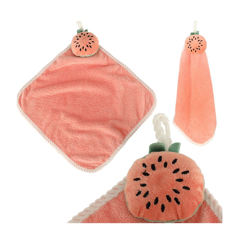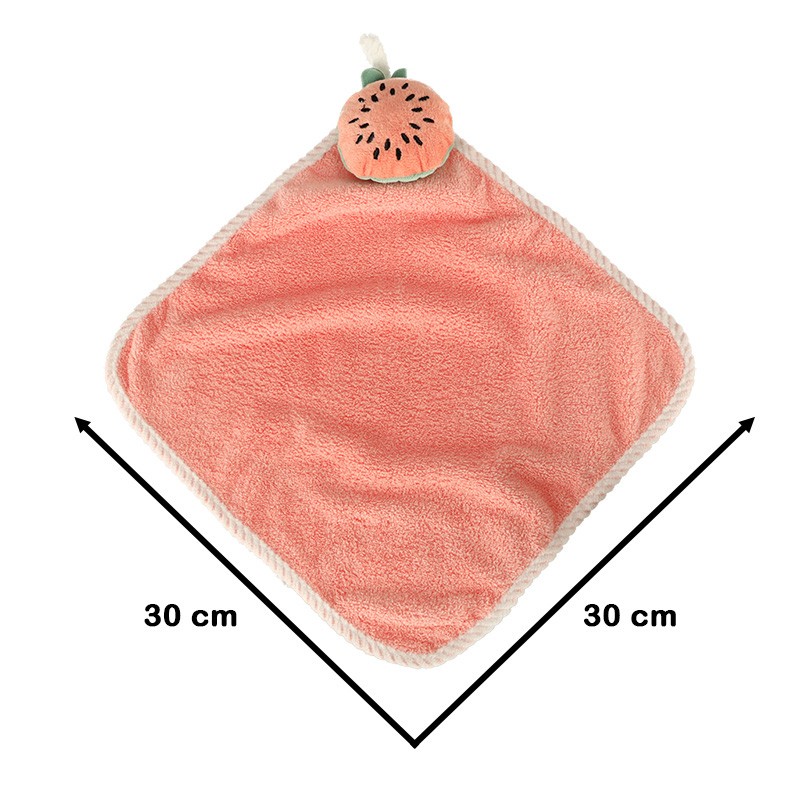 Malutki ręcznik dla dzieci do rąk - w różowym kolorze i z uroczym arbuzem. Posiada pętelkę do zawieszenia. Jest niezwykle mięciutki i przyjemny w kontakcie ze skórą. Tworzywo: poliester, nylon. Wymiary: 30 cm x 30 cm.