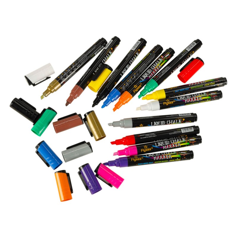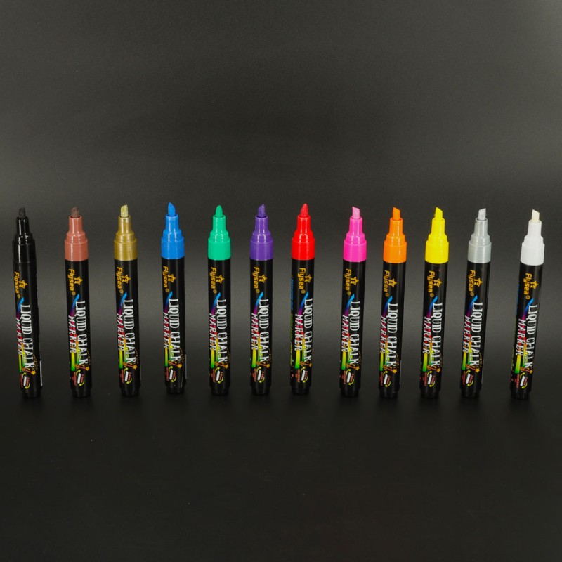 ● 12 kolorowych markerów kredowych: biały, czarny, czerwony, różowy, żółty, zielony, niebieski, fioletowy, pomarańczowy, brązowy, złoty i srebrny