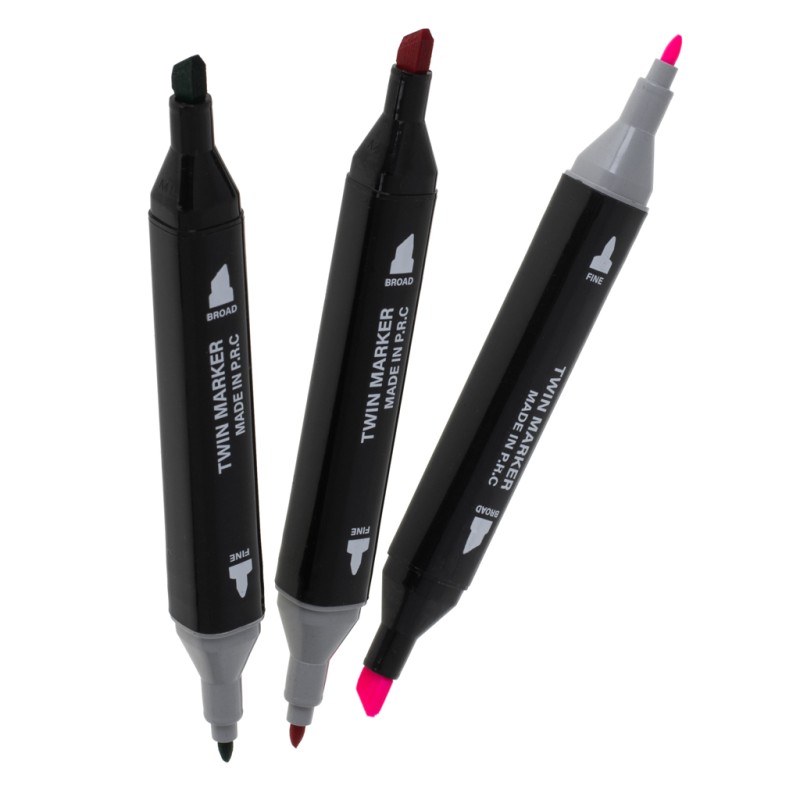 Każdy marker ma dwie końcówki, szeroką – idealną do zamalowywania większych powierzchni oraz cienką – do tworzenia cienkich i bardziej precyzyjnych linii, aby dopracować szczegółów. Odpowiednio dobrana końcówka zapewni szczegółowość rysunku lub lepsze jego pokrycie.