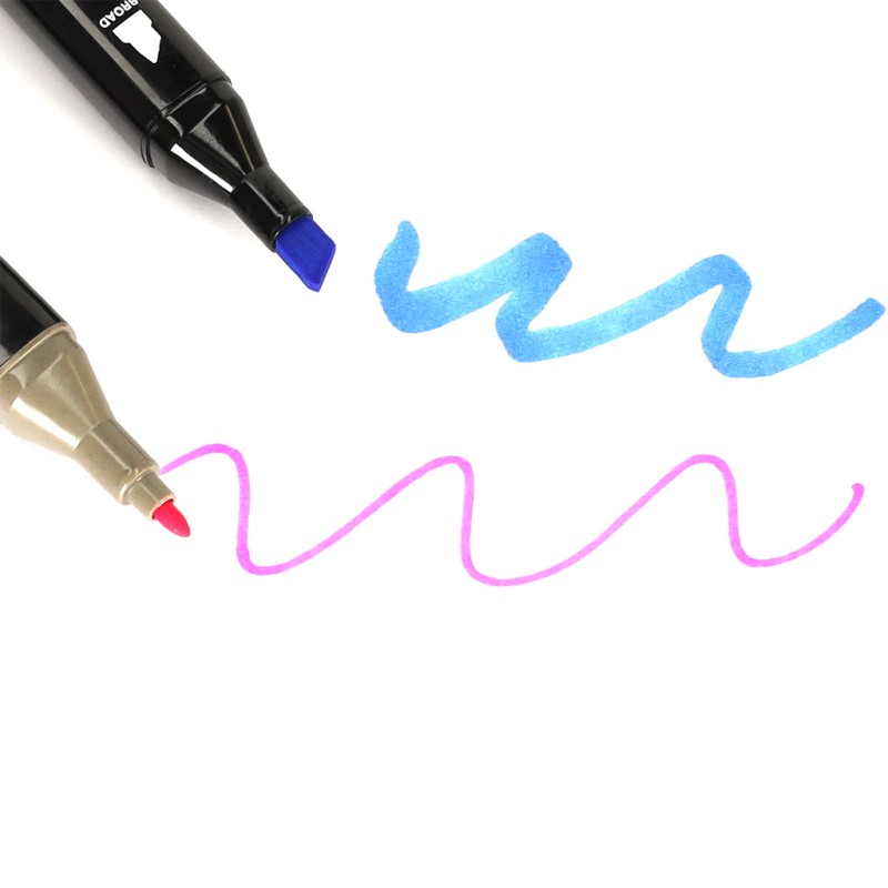 Każdy marker ma dwie końcówki, szeroką – idealną do zamalowywania większych powierzchni oraz cienką – do tworzenia cienkich i bardziej precyzyjnych linii, aby dopracować szczegółów. Odpowiednio dobrana końcówka zapewni szczegółowość rysunku lub lepsze jego pokrycie.