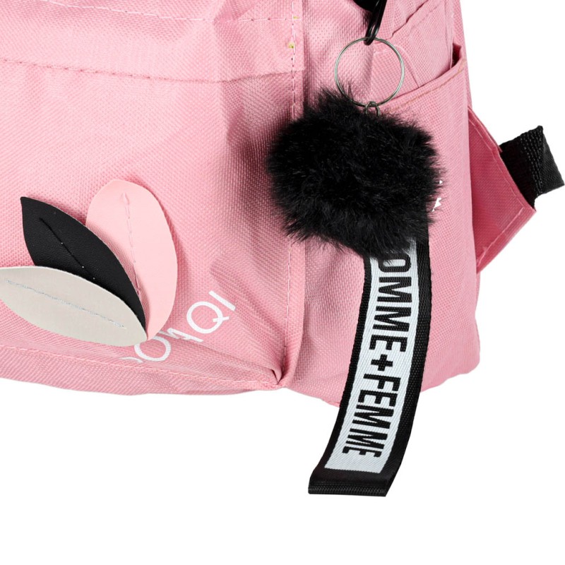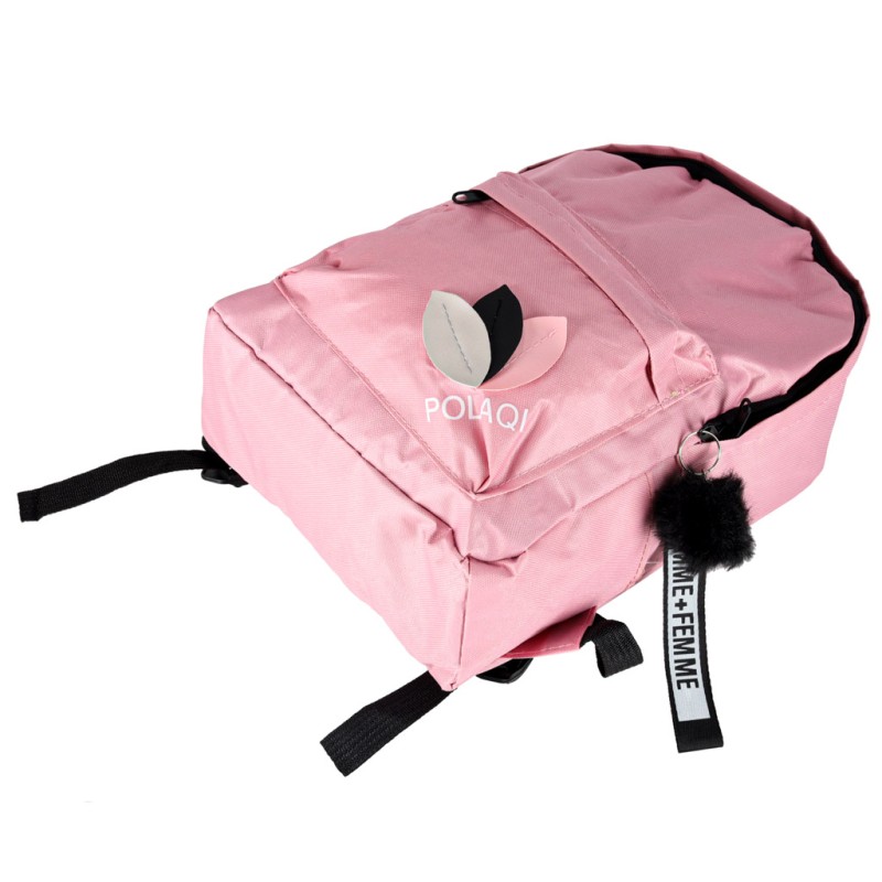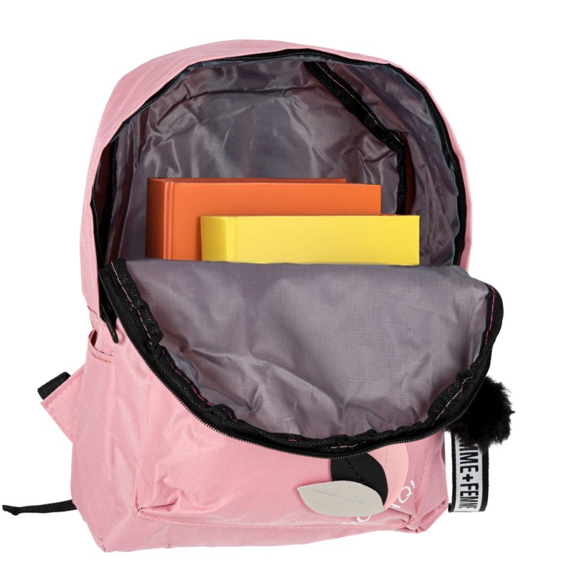 Różowy minimalistyczny plecak szkolny dla dzieci i młodzieży z breloczkiem. Ma wymiary 35 cm x 10,5 cm x 25 cm i jest wykonany z poliestrowej tkaniny Oxford. Odpowiedni dla dzieci i młodzieży chodzących do szkoły podstawowej.