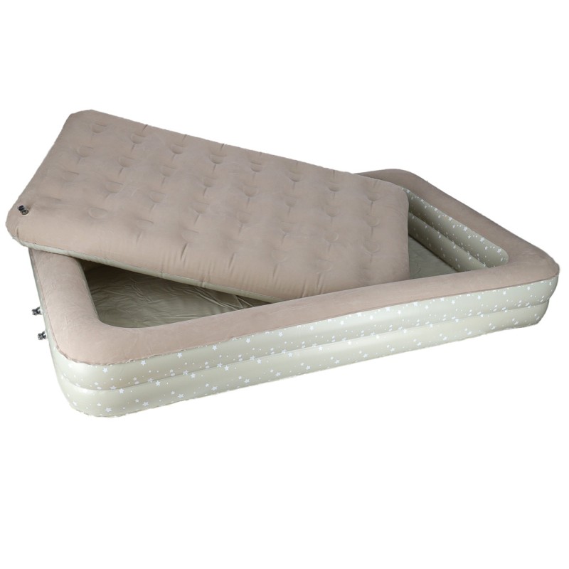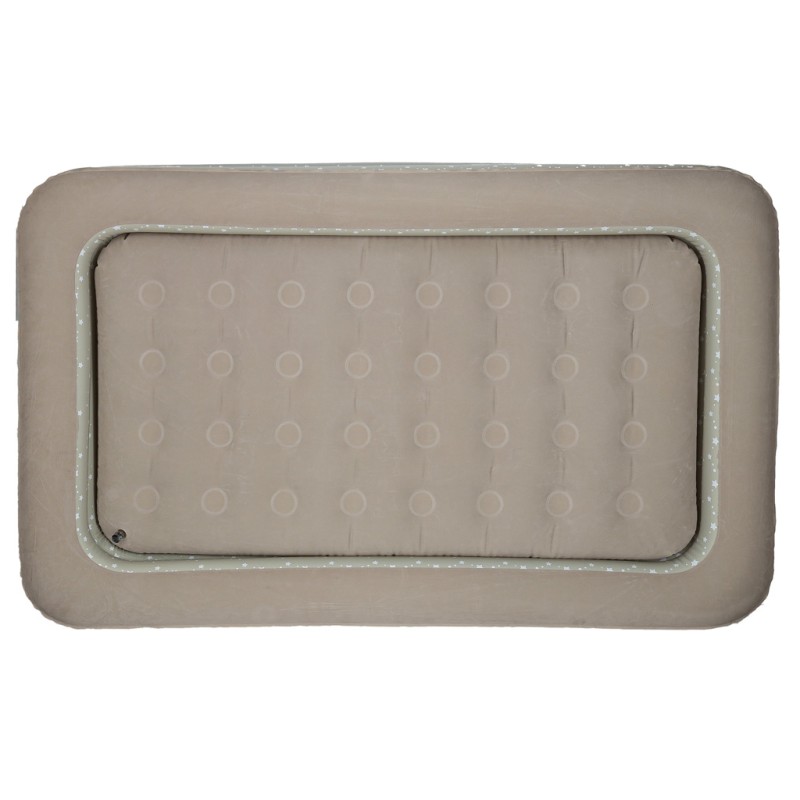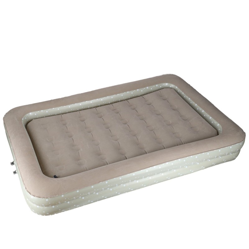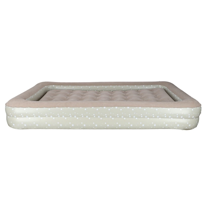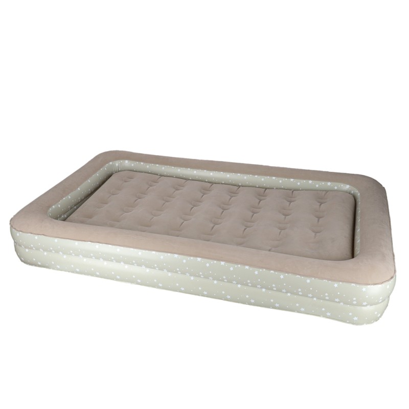 Dwuczęściowe turystyczne łóżko dziecięce w jasnoszarym kolorze do napompowania. Przydatne podczas nocowania poza domem lub na wakacjach. W zestawie ergonomiczna pompka z trzema końcówkami. Wymiary: 140 cm x 90 cm x 20 cm