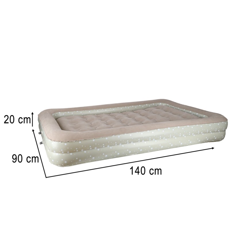 Dmuchany materac do spania dla dzieci jest praktyczny, a zarazem wygodny. Posiada praktyczne dwuczęściowe zawory, które ułatwiają pompowanie materaca oraz zapobiegają gwałtownemu ujściu powietrza na zewnątrz. Materac jest wykonany z trwałego materiału PVC – u góry ma miękką fakturę przypominającą welur, zaś po bokach ma wzór w drobne gwiazdki.